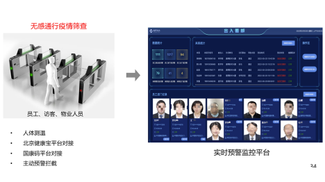 无感通行疫情筛查,接入北京健康宝、国康码平台。实时预警监测。